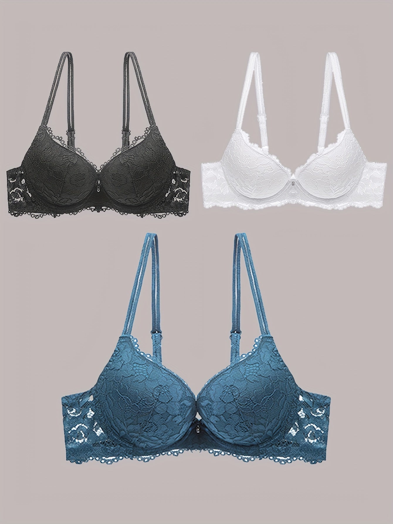 3pcs Contrast Lace Push Up Bras, Comfy & Breathable Intimates Bra, Women's Lingerie & Underwear