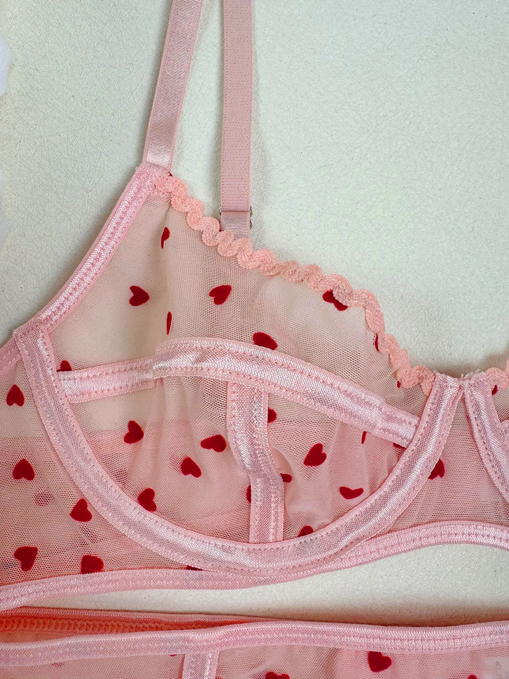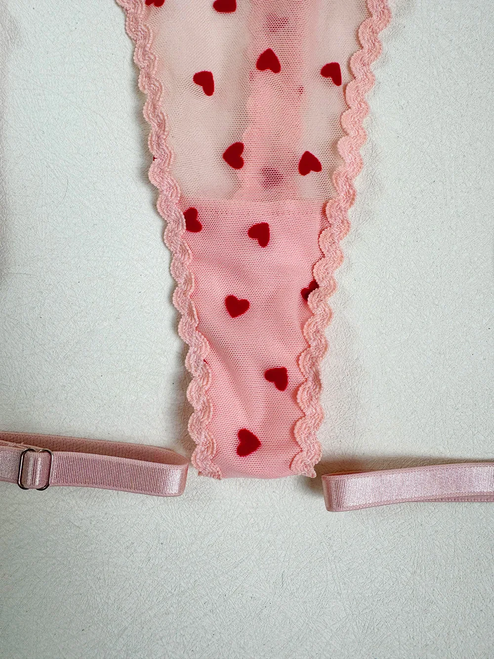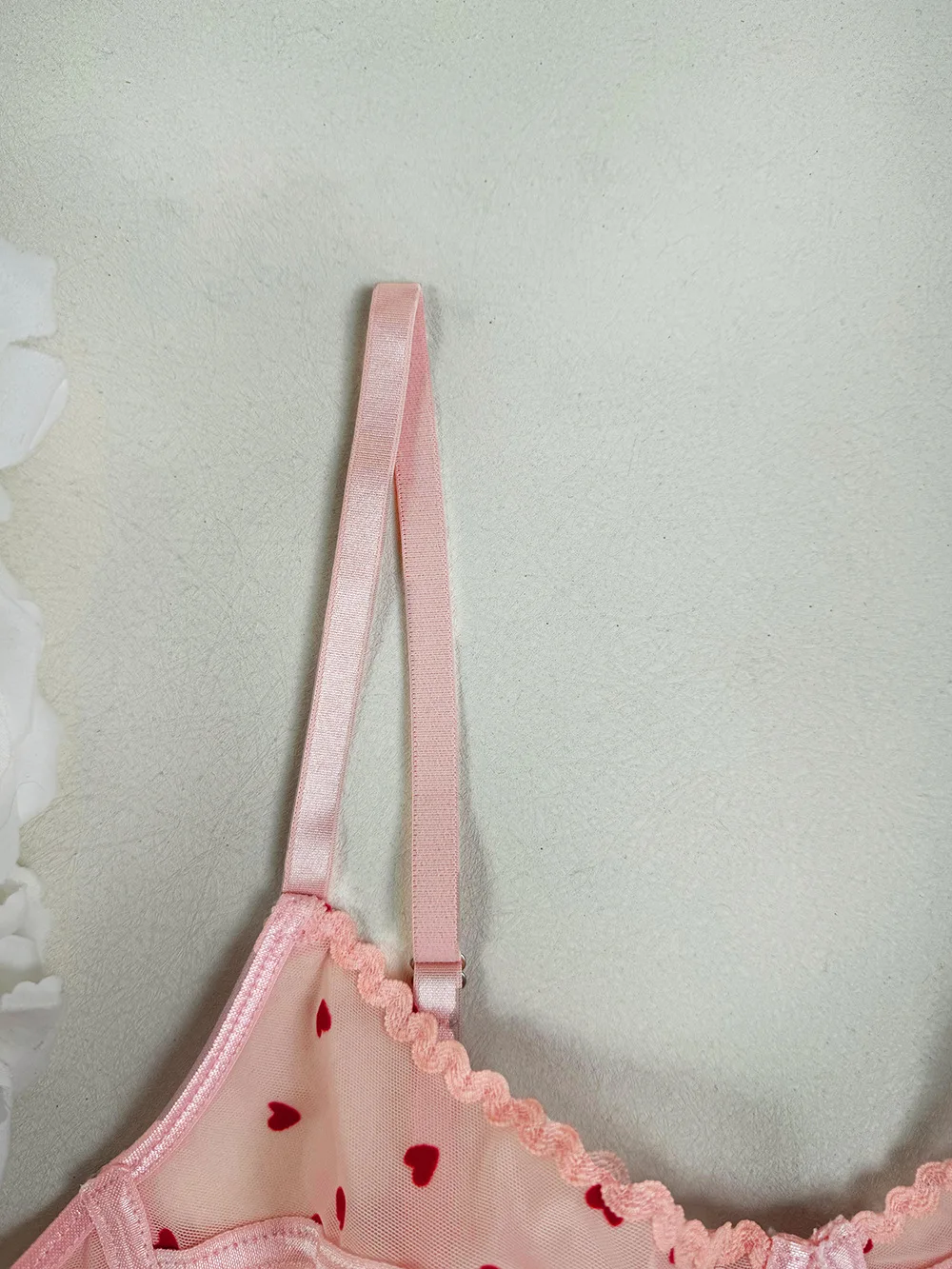 French Ultra Thin Women Underwire Set Sexy Lace Peach Heart Embroidery Bra Set Romantic Pink Transparent Lingerie With Thong