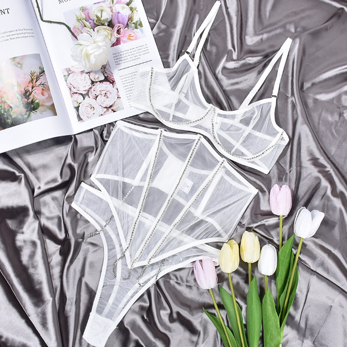 Mesh fishbone diamond chain sexy shaping waist split body seductive and fun lingerie