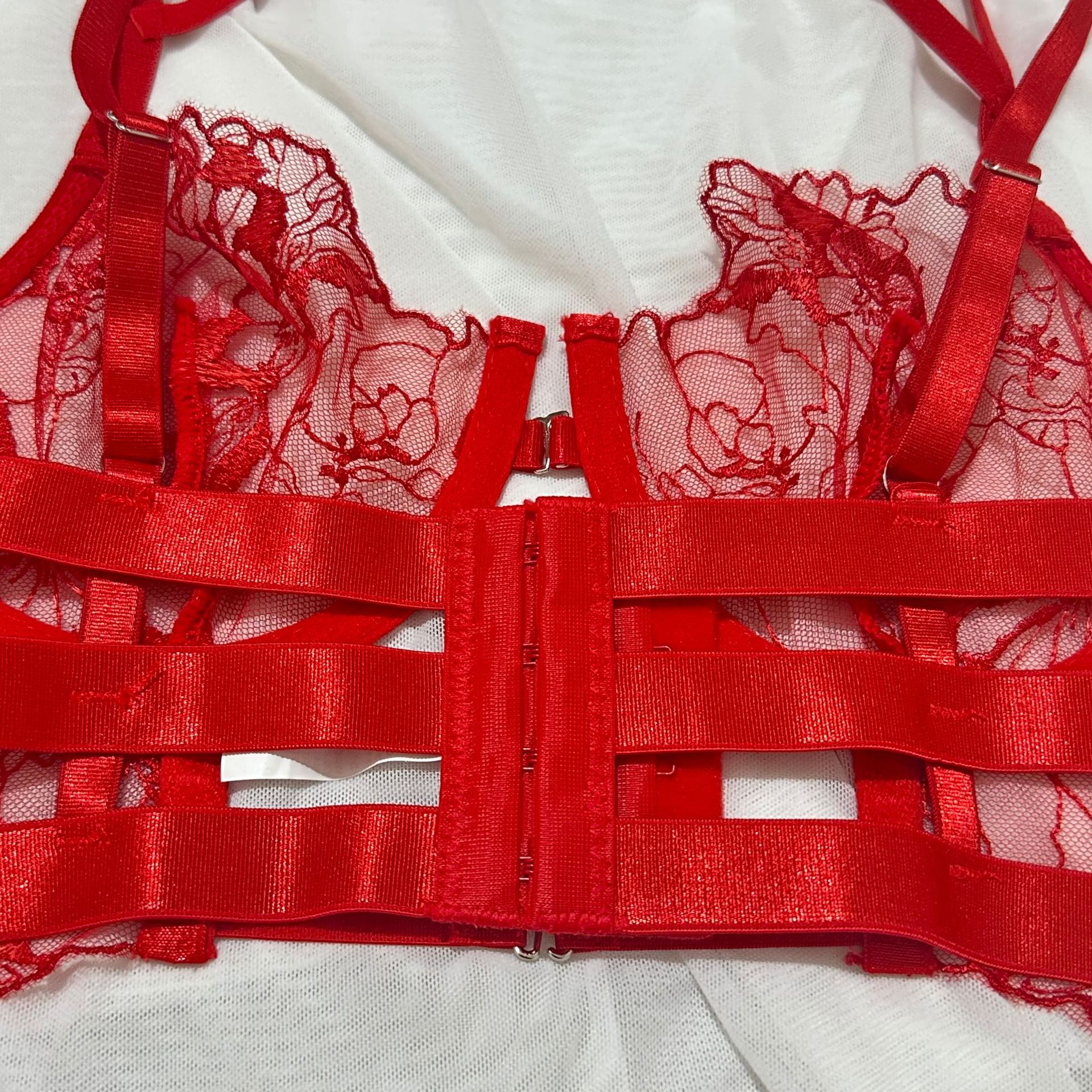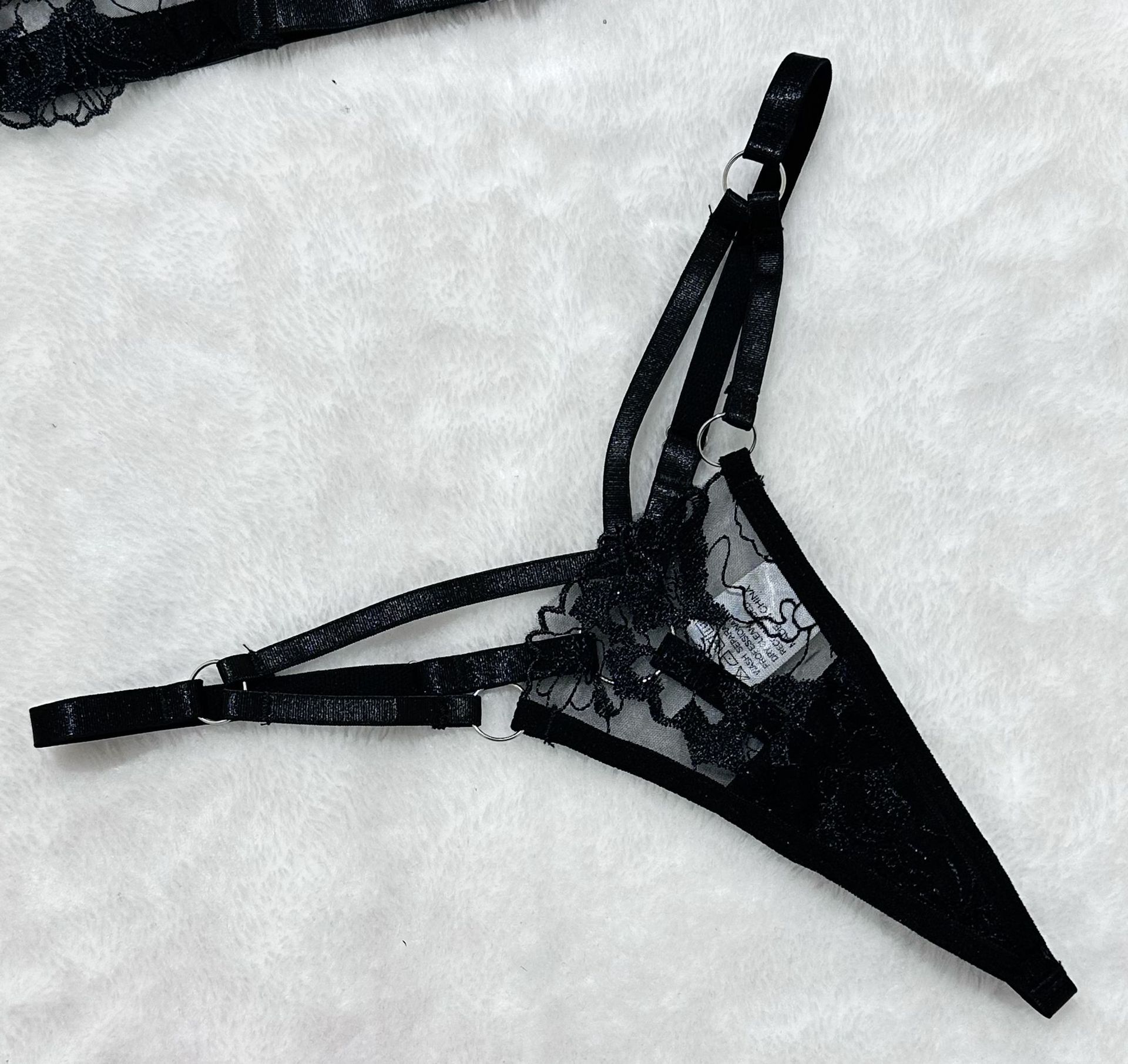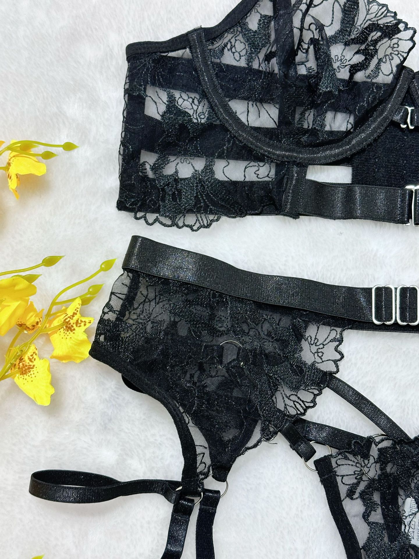 Sexy Cross-Strap Embroidered Sheer Mesh Splicing Lingerie Set for Women