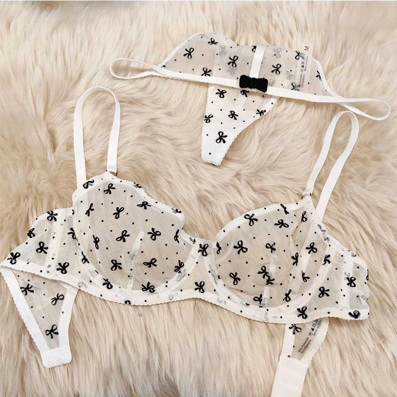 Ultra-thin lace lingerie set flocking printed thin straps comfortable breathable gathered sexy girls bra women large underwear
